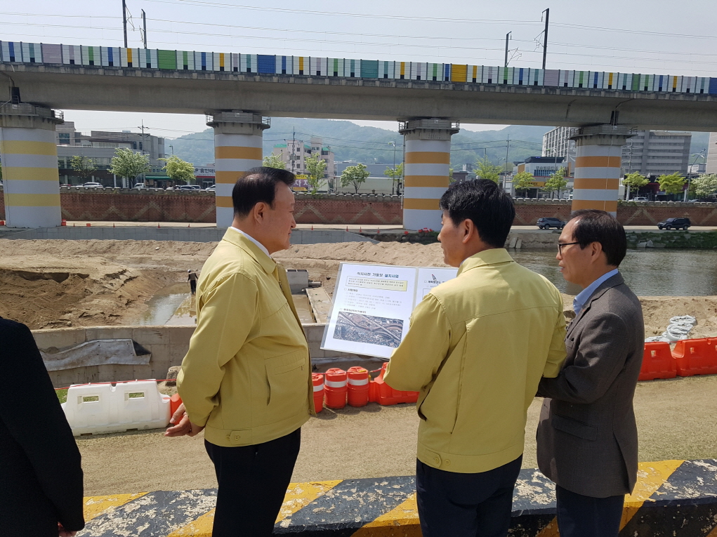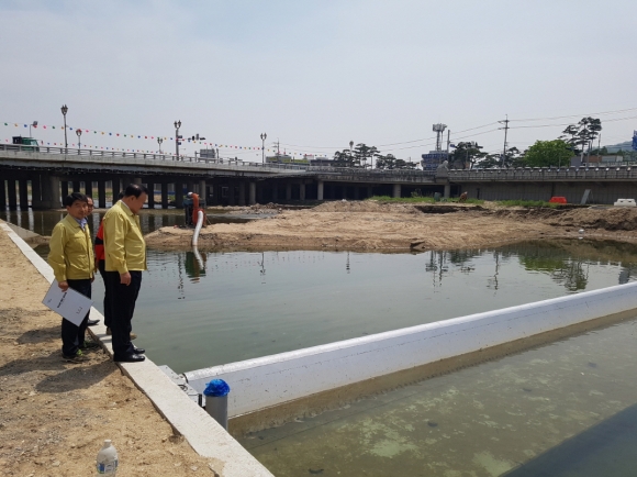 박보생 김천시장은 가동보 공사 현장 점검에서 “많은 시민들이 찾는 직지천과 감천에 설치되는 가동보의 활용으로 친수공간 제공과 함께 하천유지관리에도 철저를 기하겠다”고 밝히고, “임기가 끝나는 날까지 각종 현안 사업들이 차질없이 진행되도록 하고 안전관리에도 최선을 다하겠다”고 강조하였다. |