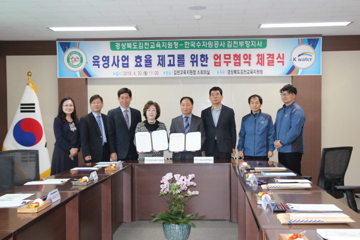 김천교육지원청 신정숙 교육장과 한국수자원공사 김천부항댐 김동진 지사장을 비롯한 양 기관 관계자 10여명이 참석한 가운데 댐 주변지역 지원사업의 일환으로 시행하고 있는 육영사업의 가치 향상과 효과 제고를 위해 상호 협력과 발전을 위한 업무협약을 체결하였다.