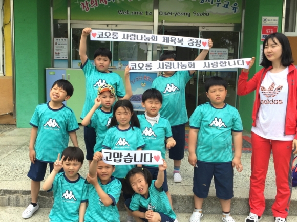 | 지역 대표 기업인 ㈜ 코오롱 인더스트리 사랑나눔회(김천 제2공장 산하, 총무 강신귀)는 제96회 어린이날을 맞이하여 개령서부초등학교(교장 김기윤) 입학생 8명과 전입생 1명, 재학생 1명에게 체육복을 증정하여 다시 한 번 사회적 기업의 귀감이 되고 있다.