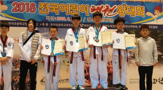 | 김천동신초등학교(교장 이형석) 태권도부 학생들은 지난 4월 21일부터 25일까지 5일간 강원도 화천군 실내체육관에서 성대하게 개최된 ‘2018 전국어린이 태권왕 대회’에 선수 7명이 출전하였다.
