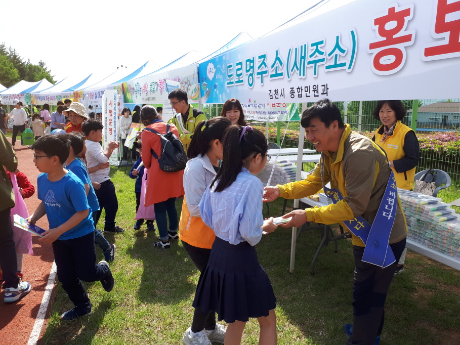 지난 5일 성황리에 끝난 제23회 김천어린이날 큰잔치 행사에 참석한 어린이와 부모님들에게 〃우리집 주소는 새주소로“라는 문구가 새겨진 도로명주소 홍보물(3색 형광펜)을 나누어주어 뜨거운 호응을 얻었고, 미래의 주역인 어린이들에게 우리집 도로명주소가 무엇인지 알 수 있는 기회를 제공하였다.