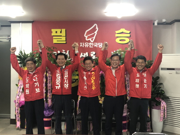|  | | | ⓒ 김천내일신문 | | 자유한국당 경북도지사 후보를 배출한 경북 김천이 자유한국당 돌풍의 진원지로 떠오르고 있는 가운데 6.13 지방선거를 준비하는 자유한국당 도지사, 국회의원, 시장후보가 한 자리에 모여 필승의 결의를 다졌다.