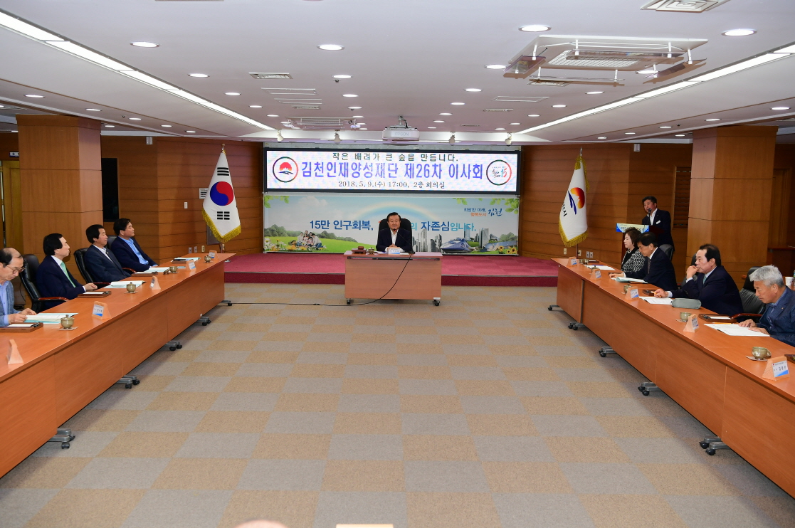 | 김천시인재양성재단(이사장 박보생)에서는 5월 9일(수) 오후5시 김천시청 2층 회의실에서 2018년도 김천시인재양성재단 제26차 이사회를 개최했다.