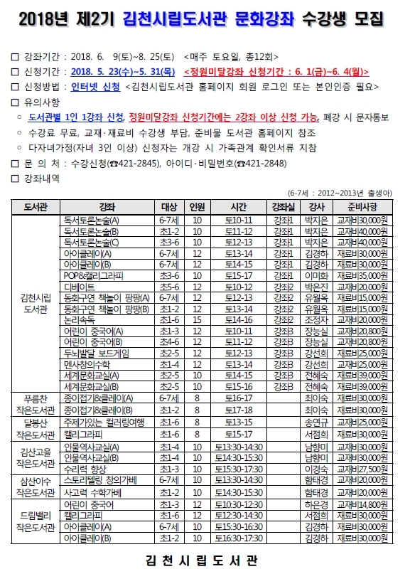 수강신청은 김천시립도서관 홈페이지에서 신청하면 되며, 자세한 사항은 홈페이지를 참조하거나 사서담당(☎421-2845)으로 문의하면 된다.