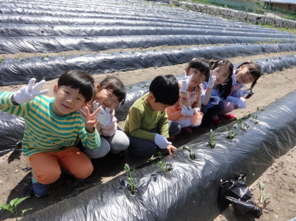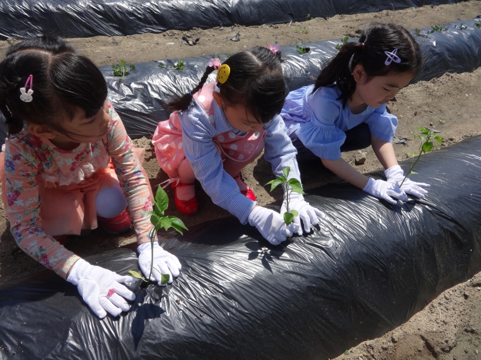 사전에 유아들과 키우고 싶은 작물을 이야기 나눈 후 땅콩, 방울토마토, 가지, 고추, 고구마 등을 가꾸기로 하고 모종을 준비해 학교 옆 텃밭에 심었다.