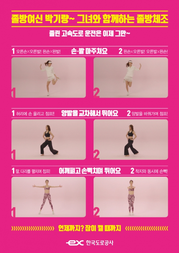 최근 5개년 고속도로에서 졸음운전으로 인한 교통사고 평균 건수는 423건, 사망자 76명에 달하고, 치사율은 18%로 일반사고 치사율 8%와 비교해 2배 이상 높다. 이에 한국도로공사는 국립교통재활병원과 함께 졸음운전 방지에 실질적으로 효과가 있는 동작들을 선정해 누구나 쉽게 따라할 수 있는 졸음운전 방지운동을 제작했으며, 도로공사 홍보대사인 치어리더 박기량씨가 모델로 참여했다.