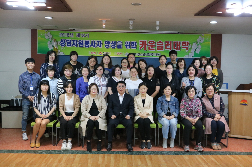 | 김천시청소년상담복지센터(센터장 김기식)는 5월 15일 청소년상담복지센터 2층 교육장에서 2018년 청소년상담자원봉사자 양성을 위한 “카운슬러 대학” 수료식을 실시하였다.