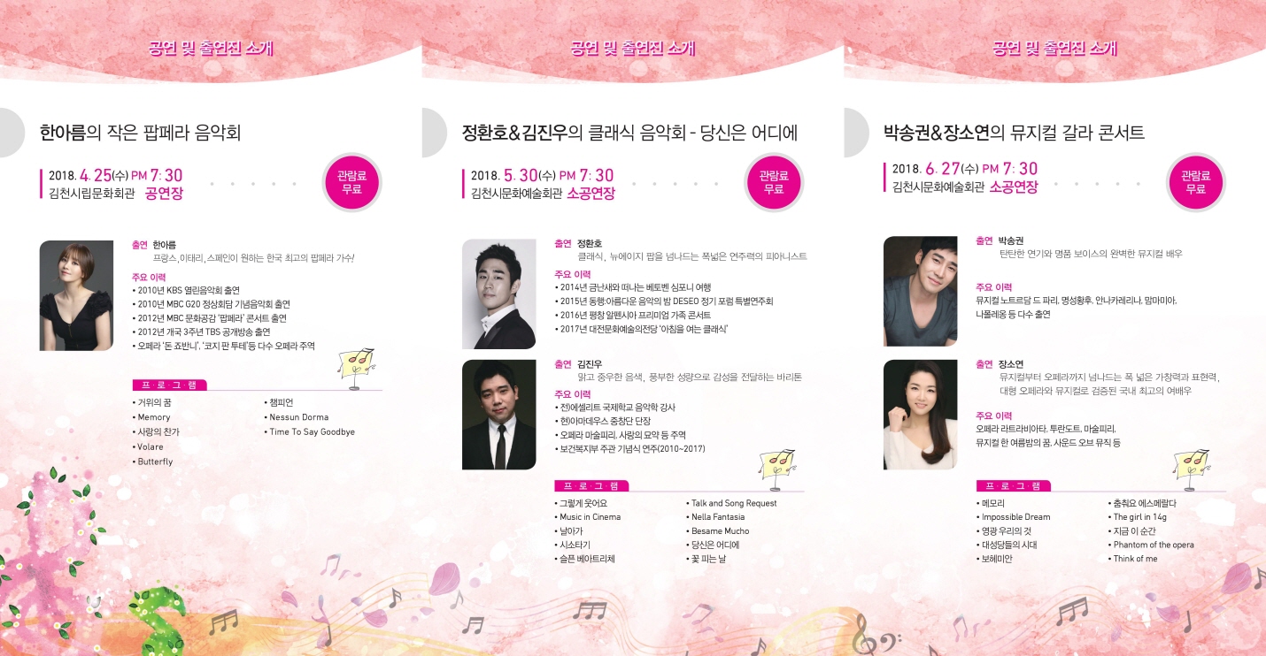 이 공연은 문화체육관광부가 주최하고 한국문화예술회관연합회와 김천시가 주관하여 국비를 지원 받아 진행하는 사업으로 이번 5월 공연은 클래식, 뉴에이지 팝을 넘나들며 폭 넓은 연주력을 가지고 피아니스트 ‘정환호’와 맑고 중우한 음색, 풍부한 성량으로 감성을 전달하는 바리톤 ‘김진우’를 초청하였다. ‘넬라판타지아’, ‘베사메 무쵸’, ‘당신은 어디에’ 등 어렵지 않고 평소 친숙하게 들어본 음악으로 클래식에 쉽게 접근할 수 있도록 기획하였다.