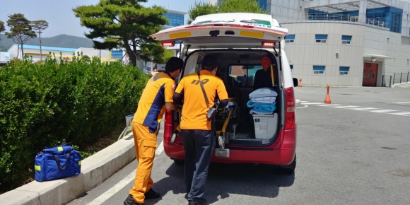 중점 훈련내용은 화재발생 상황부여, 관계자 등의 화재상황 전파 및 119신고, 근무자 등의 피난대피유도, 소화기 및 옥내소화전을 이용한 초기화재진압 활동, 부상자 응급처치 및 후송 순으로 실시됐다.