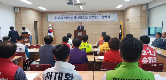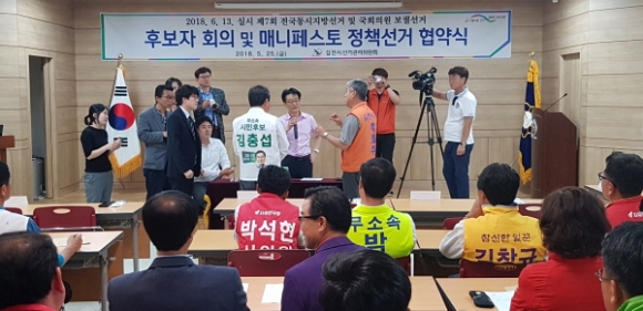 |  | | | ⓒ 김천내일신문 | | 김천시 선거관리위원회에서는 5월25일 제7회 전국동시자방선거를 18일 앞두고 있는 가운데 일 무소속 후보자 기호추첨, 회의 및 매니 페스트 정책선거 협약식을 가졌다. 국회의원보궐선거 후보자는 기호2번 자유한국당 송 언 석 후보, 기호 6 번 무소속 최 대 원 후보. 김천시장선거 후보자는 기호2번 자유한국당 김 응 규 후보,기호6번 무소속 박 희 주 후보, 기호 7 번 무소속 김 충 섭 후보자. 경상북도의회의원선거 김천시 제1선거구 기호1번 더불어민주당 배영애,기호2번 자유한국당 나 기 보후보자 김천시 제2선거구 기호 2 번 자유한국당 이순기 후보자,기호 6번 무소 속 박판수후보자 지역구 김천시의회 기초의원선거 “가”선거구 기호 1번 더불어민주당 김동기 후보, 2-가 자유한국당 백성철 후보 2-나 자유한국당 박 석 현후보, 2-다자유한국당김영민후보 가호3 번 바른미래당 임 언배 기호6번 무 소 속 이 우 청후보,기호 7번 무소속 박 우 도 후보, "나" 선거구 2-가 자유한국당 김세운 후보 ,2-나 자유한국당 진 기 상 후보 “다”선거구 2-가 자유한국당 전계숙 후보, 2-나 자유한국당 박광수 후보, 기호6번 무 소속 손 진 원 후보 기호7번 무소속 배 형 태 후보, 기호8번 무소속 김 병 철 후보. “라” 선거구 2-가 자유한국당 정재정 후보, 2-나 자유한국당 이승우 후보, 기호6번 무소속 박 영 록 후보, 기호7번 무소속 이 성 찬후보. “마”선거구 2-가 자유한국당 이진화 후보, 2-나 자유한국당 남용철 후보.기호2-다 자유한국당 조 익 현 후보 기호6번 무소속 전 대 환 후보 기호7번 무소속 이 명 기 후보. “바”선거구 2-가 자유한국당 이 복 상 후보 2-나 자유한국당 송희종 2-다 자유한국 당 이한림 후보 기호3번 바른미래당 이상영 후보 기호6번 무소속 김창규,기호7번 무 소속 김 정 환 후보. 기호8번 무소속 나영민 후보, 기호9번 무소속 송호근 후보, 기호10번 무소속 이 선 명 후보, 기호11번 무소속 강 종 석 후보, 기호12번 무소속 김태 철 후보. 비례대표 김천시의회의원선거 기호1번 더불어민주당 기호2번 자유한국당 기호3번 바른미래당