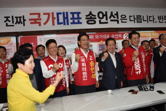 자유한국당 홍준표 대표 송언석 후보 선거사무소 깜짝 방문