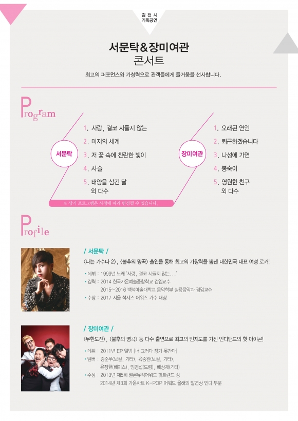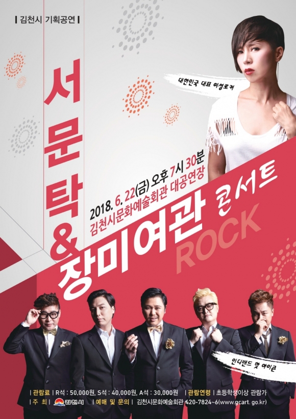 | 김천시문화예술회관(관장 장귀희)에서는 시민들의 삶에 활력 있는 에너지를 제공하기 위하여 ‘서문탁&장미여관 콘서트’를 오는 2018. 6. 22(금) 오후 7시 30분 김천시문화예술회관 대공연장에서 개최한다.