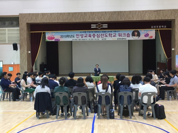 | 김천초등학교(교장 정명헌)는 5월 30일(수) “선생님, 걱정말아요.”주제로 전라북도교육청 장학사 김성효 작가를 초청하여 인성교육중심 워크숍을 실시하였다. 김천초등학교는 2018학년도 인성교육중심선도학교로 지정되어 “ALL바름 수업으로 행복하고 탁월한 교사로 거듭나기”주제로 다양한 인성교육중심 연수, 수업공개 등을 실시한다.