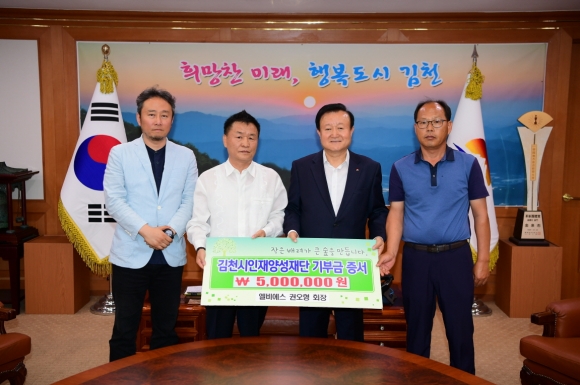 | 엘비에스 권오형 회장이 6월 4일 김천시청을 방문하여 김천시인재양성재단(이사장 박보생)에 오백만원의 장학금을 기탁했다.