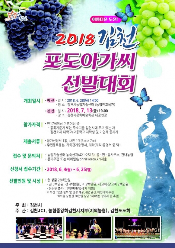 | 김천시에서는 오는 7월 13(금) 문화예술회관에서 2018 김천포도아가씨 선발대회를 개최한다. 농·특산물 홍보를 목적으로 1996년에 1회 대회를 시작하였다. 올해로 13회째를 맞이하는 전통 있는 대회로 6월 5일부터 참가신청을 받는다.