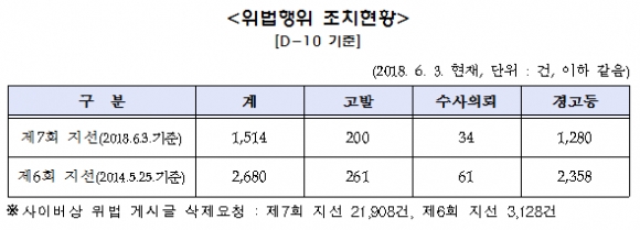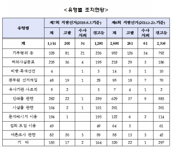Ⅱ조치현황 및 사례 선거관리위원회는 이번 지방선거에서 총 1,514건(2018. 6. 3, D-10 기준)의 선거법 위반행위를 조치하였습니다. 이는 지난 제6회 지방선거 대비 44% 정도 감소하였는데요. 사전안내 우선의 원칙에 따른 적극적 예방활동과 경미한 위법행위는 안내 또는 현지시정 조치하는 방침에 따라 행정조치가 대폭 감소하였기 때문입니다. 또한, SNS 등 온라인 선거운동의 활성화와 여론조사 공표기준이 강화되어 사이버 선거범죄가 증가한 반면, 전통적인 인쇄물·시설물 관련 위법행위는 감소하였습니다.