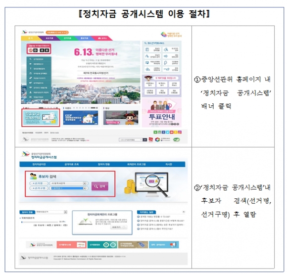 선거관리위원회는 5월 31일부터 지방선거 및 재·보궐선거 후보자의 정치자금 수입·지출내역을 중앙선관위 홈페이지 ‘정치자금 공개시스템(http://ecost.nec.go.kr)’에 실시간 공개하고 있습니다. 후보자가 선거관리위원회에서 제공한 ‘정치자금 회계관리프로그램’에 정치자금 수입·지출내역을 입력‧전송하면 실시간으로 공개되며, 누구든지 이를 열람할 수 있습니다. 선거관리위원회는 후보자가 자발적으로 정치자금 수입·지출내역 공개함으로써 깨끗한 이미지를 홍보할 수 있고, 유권자는 후보자 간의 정치자금 수입‧지출내역을 비교‧확인할 수 있어 후보자를 선택하는데 도움이 될 것으로 보고 있습니다. ‘정치자금 공개시스템’은 정치자금의 투명성을 높이고 유권자의 알권리 보장을 위해 지난 2014년 제6회 지방선거에 처음 도입되어 시도지사 및 교육감선거 후보자 128명 중 70명(54.7%)이 참여하였으며, 2016년 제20대 국선에서는 후보자 10명 중 4명 이상이 정치자금 수입‧지출내역을 공개하였습니다. 이번 지방선거에는 6월 2일 현재 시도지사 및 교육감선거 후보자 130명 중 25명(19.2%)이 참여하고 있습니다.