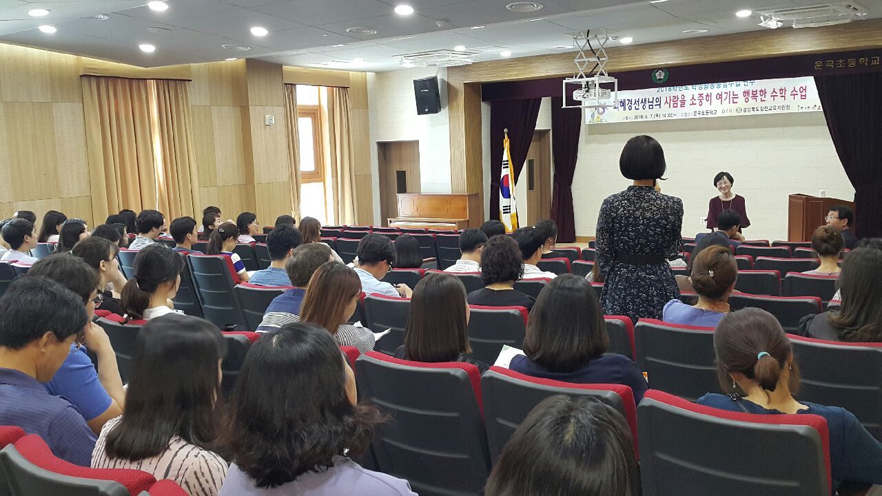 지난해 대한민국 스승상 대상 수상자이자 EBS다큐프라임 ‘교육대동여지도’에서 아이들 스스로 답을 찾는 수학 수업으로 소개된 바 있는 대구대명초 최혜경수석선생님이 운곡초 6-3반 학생들을 대상으로 직접 수업 시연을 하였다. 80여명의 교사들은 진지하게 수업을 참관하였으며 수업 후에는 최혜경선생님과의 열띤 질의 응답으로 가득한 참여형 연수회가 이어졌다. 2018학년도 김천교육지원청 학생활동중심수업 연수회는 3회에 걸쳐 실시되며 6월 14일(목)에는 서근원교수님의‘아이 눈으로 수업 보기’가, 9월 11일(화)에는 김성환선생님의‘학급긍정훈육법’이 차례로 실시될 계획이다.