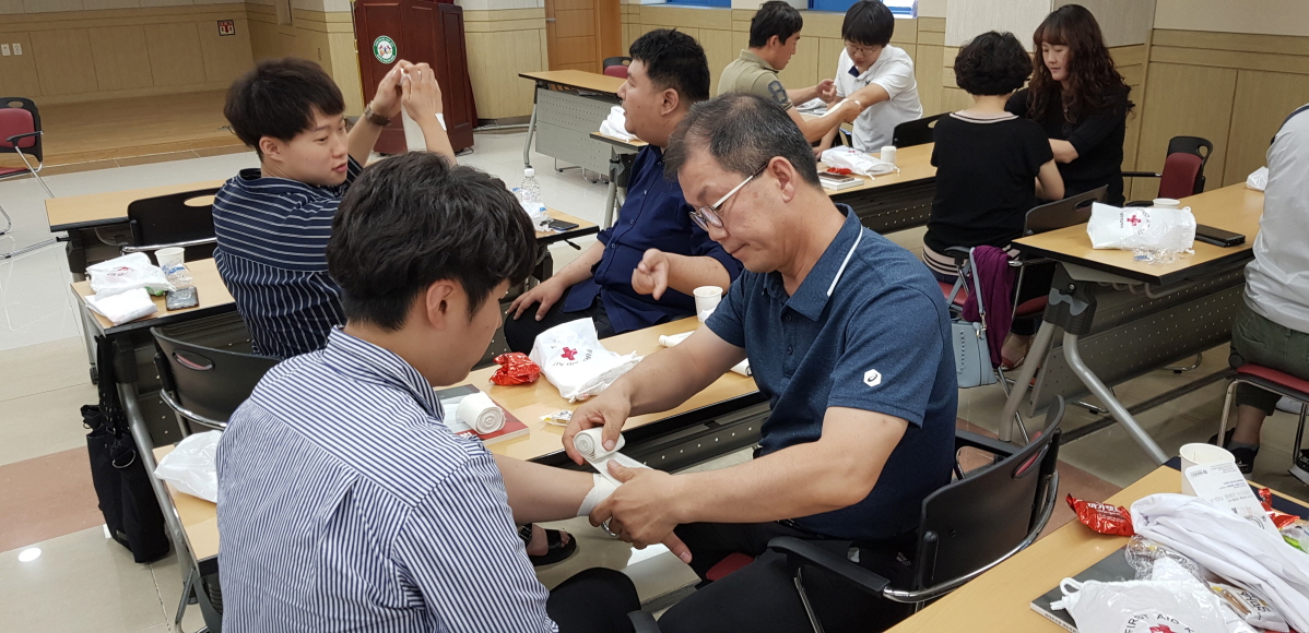 연수의 주요 내용은 ▸사고 시 대처요령 ▸심폐소생술 및 자동제세동기 사용 실습 ▸수상․교통안전 교육 ▸재난안전 교육 ▸상처치료 및 붕대 사용법 등으로 실습과 체험 위주로 구성되었다.