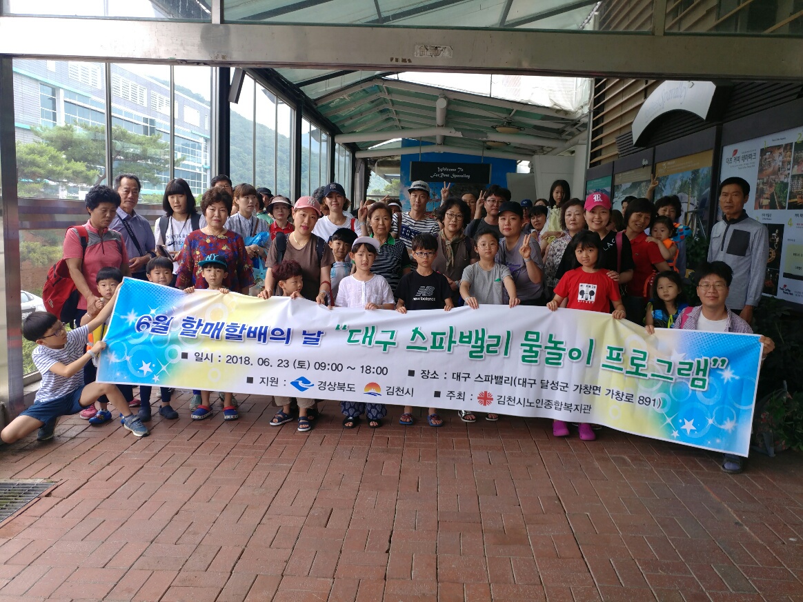 6월 할매할배의 날인 지난 6월 23일(토)에는 노인종합복지관 주관으로 3대(三代) 86명이 달성군 가창면에 있는 스파벨리 워트파크 체험을 다녀왔다. 참가자들은 워트파크에 도착하여 물놀이 안전교육 및 준비운동을 마친 후 함께 물놀이 체험을 즐겼다. 손주들은 파도풀․유수풀드래곤 슬라이드를 바쁘게 오가며 즐거움을 만끽했고, 어른들은 온천찜질방에서 담소하며 즐거운 시간을 보냈다. 이날은 한 여름 못지않은 뜨거운 날씨로 물놀이가 제격이었고, 3대가 함께 맛있는 음식도 먹고 휴식을 즐기며 가족의 정을 확인하는 뜨거운 하루였다.
