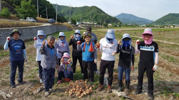 | 김천시 지례면사무소(면장 모문용) 직원 12명은 양파수확 막바지에 접어든 지난 6월 22일 지례면 상부리 소재 양파농가를 찾아 농촌일손돕기에 나섰다. 농촌인구 감소와 고령화로 갈수록 일손을 구하기 어려운 농번기에 양파수확 적기를 놓치고 있는 농가를 찾아 양파수확작업을 실시하였다.