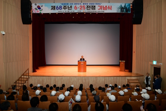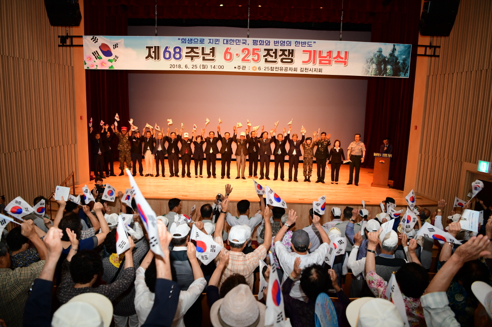 | 김천시는 6. 25(월) 김천문화회관 공연장에서 대한6.25참전유공자회 김천시지회(회장 임상도) 주관으로 「제68주년 6.25 전쟁 기념식」을 참전유공자 및 그 유족, 국가유공자, 학생, 시민 등 500여명이 참석한 가운데 호국보훈의 달을 맞이하여 국가 안보와 평화 수호의 의지를 다지는 자리를 마련했다.