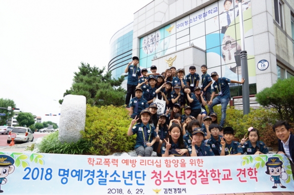 김천 명예경찰소년단은 관내 동부․신일․아포 초등학교의 모범적이고 인성이 바르며 봉사정신이 투철한 32명 학생들로 구성, 교내 학교폭력 예방을 위한 캠페인은 물론 학교폭력 예방 순찰, 등굣길 교통안전 활동 등 청소년 선도그룹 역할을 하고 있다.