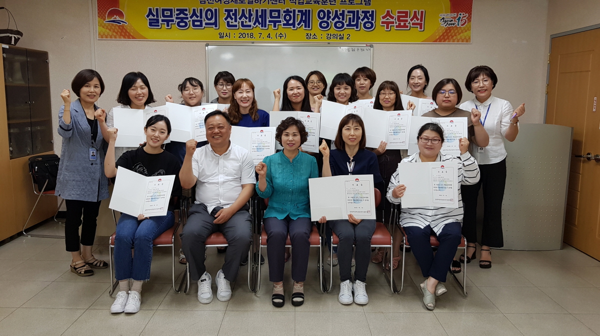 | 김천시평생교육원에서 운영하는 여성새로일하기센터(센터장:김금숙)는 7월 4일(수) 직업교육훈련과정(실무중심의 전산세무회계 양성과정) 수료식을 개최하였다.