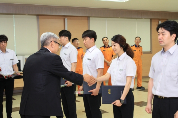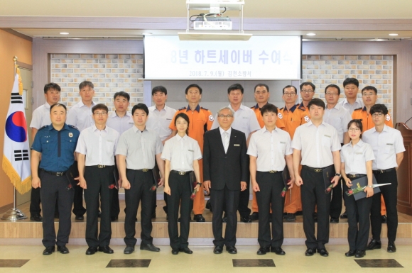 | 김천소방서(서장 이주원)는 7월 9일 위급한 상황에서 신속하고 적절한 응급처치로 소중한 생명을 구한 시민과 구급대원 및 펌뷸런스 대원 9명에게 하트세이버(Heart Saver) 인증서와 배지를 수여했다.
