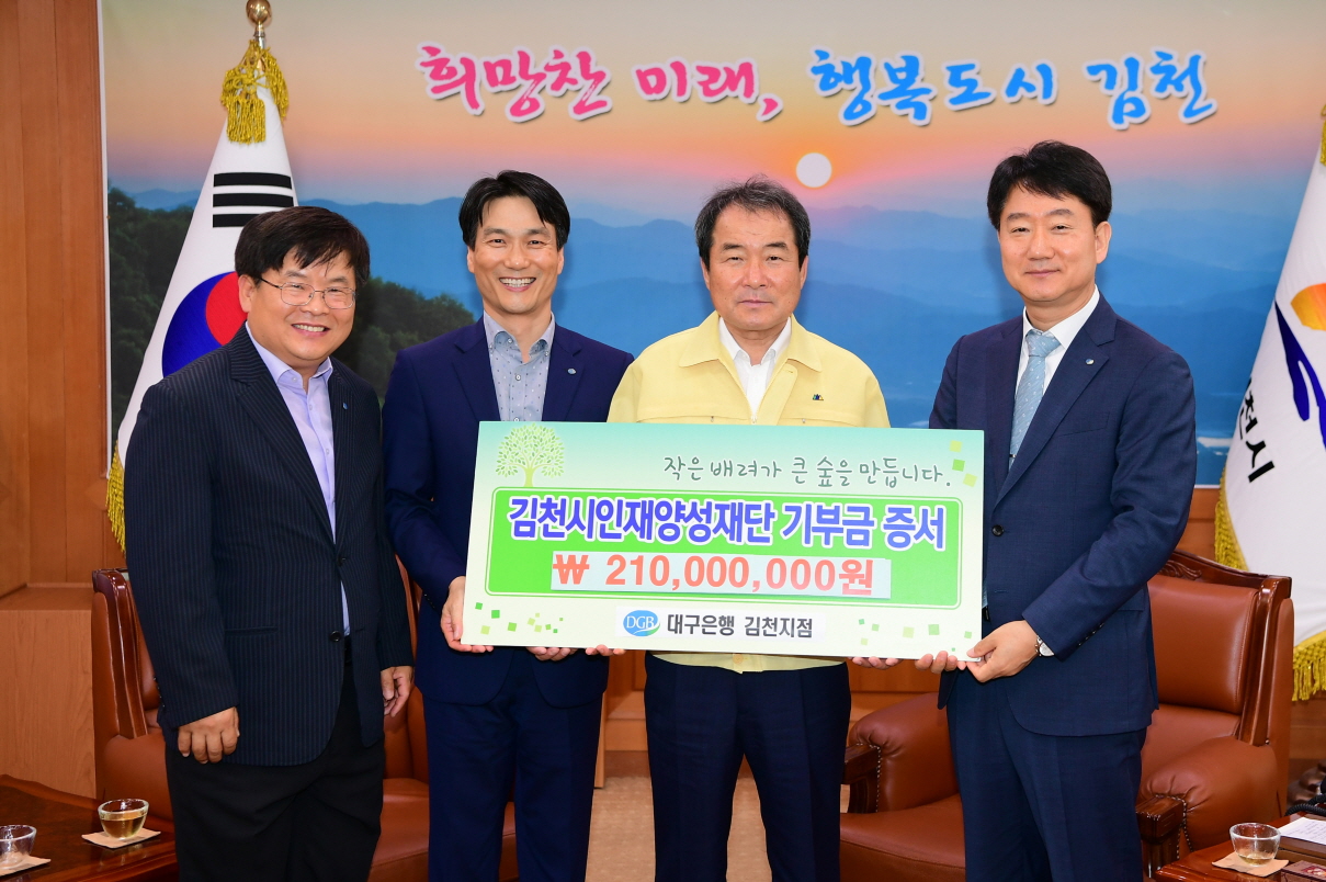 | 대구은행 김천지점(지점장 박영효)에서 7월 10일 김천시청을 방문하여 김천시인재양성재단(이사장 김충섭)에 장학기금 2억1천만원을 기탁했다.