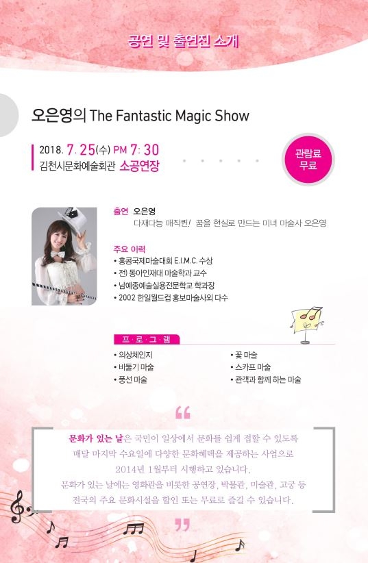 이 공연은 문화체육관광부가 주최하고 한국문화예술회관연합회와 김천시가 주관하여 국비를 지원 받아 진행하는 사업으로 이번 7월 공연은 홍콩 세계 마술대회에서 최고상을 받은 국내 최정상급 여자 마술사 ‘오은영’을 초청하여 진행한다. 다재다능한 매직 퀸 오은영은 의상 체인지 마술, 풍선 마술, 비둘기 마술, 관객과 함께 하는 마술 등을 준비하여 시민들을 찾을 예정이다.