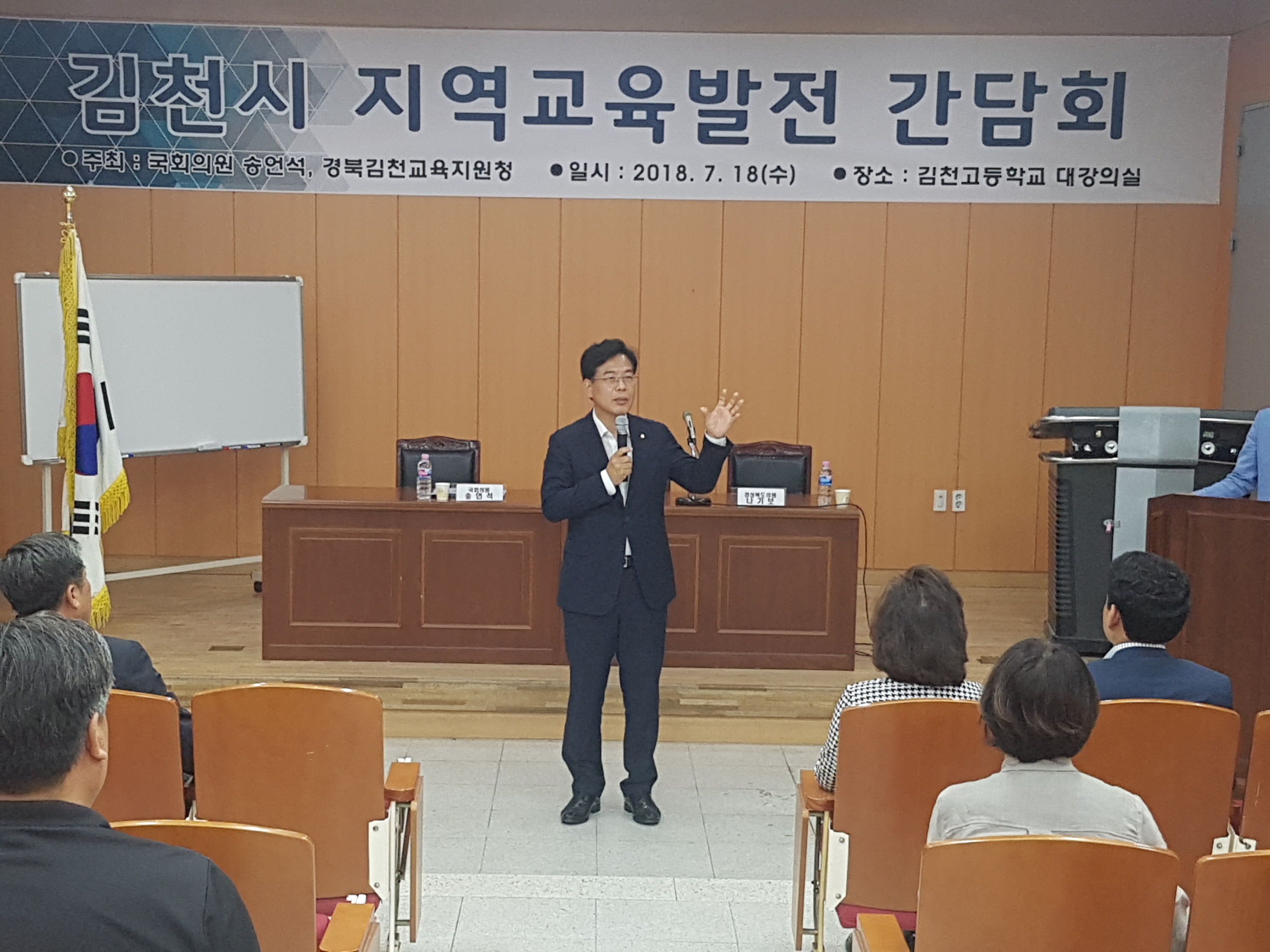 | 7월 18일, 김천고등학교 대강의실에서 김천시 지역교육발전을 위한 간담회가 열렸다. 간담회는 2회로 나누어 오전에는 초등학교, 오후에는 중·고등학교를 대상으로 진행되었다.