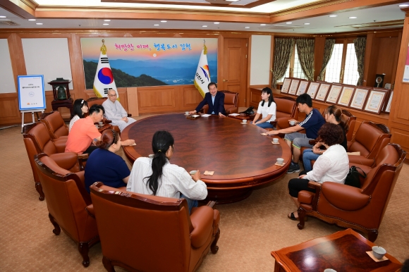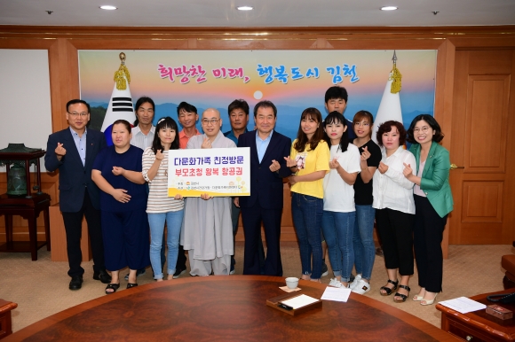 | 김천시(시장 김충섭)는 7월 19일 2층 접견실에서 중국과 베트남으로 친정방문을 떠나는 6가정과 캄보디아의 부모님을 초청하는 1가정의 다문화 가족들과 간담회를 가졌다. 김천시 ‘다문화가족 친정방문 및 부모초청 지원사업’은 2009년도부터 10년째 이어오고 있으며, 친정방문은 기준 중위소득 100%이하인 가구중 친정에 3년 동안 가지 못한 결혼이주여성을 선정하여 왕복항공료와 여행자보험을 지원하는 사업이고, 부모초청 또한 대상자 선정조건은 동일하며 모국에 계시는 부모님을 한국으로 초청하여 한국 문화탐방, 가족사진촬영 등을 지원할 예정이다.