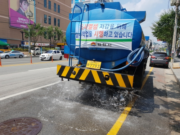 김천시는 살수차 2대를 활용 시가지 도로에 물 뿌리기 작업을 시행해 폭염으로 달궈진 도로면 온도를 저감시켜 열섬효과를 최소화 하고 노면 변형방지, 먼지제거 등 최적의 도로환경을 유지하기 위한 응급 조치라고 밝혔다.