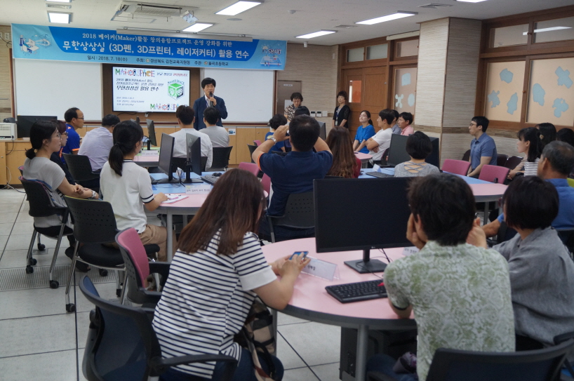 | 율곡초등학교(교장 이삼영)는 2018년 7월 18일 경상북도 김천교육지원청 주관, 율곡초등학교 주최로 2018 메이커(Maker)활동 창의융합프로젝트 운영 강화를 위한 무한상상실(3D펜, 3D프린터, 레이저커터) 활용 연수를 율곡초등학교 무한상상실 및 과학실에서 이루어졌다.