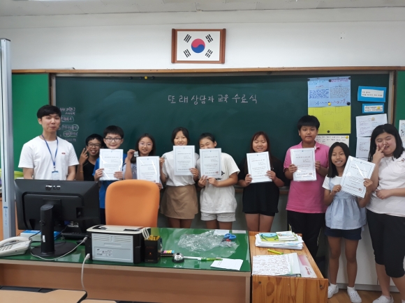 또래상담자들은 교육 수료와 함께 청소년상담개발원에서 인증하는 수료증서와 또래상담자 배지, 수첩을 제공받아 각자 학급에서 또래 상담자로 활동하며 공감과 배려의 학교문화를 만들기 위한 캠페인 활동을 월 1회 진행하기로 하였다.