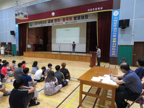 | 아천초등학교(교장 이용옥)는 글로벌 사회를 살아갈 미래의 주역인 학생들이 영어에 대한 흥미와 자신감을 기르고 자연스럽게 영어를 표현할 수 있는 의사소통능력을 기르는 데 도움을 주고자 7월 19일(목) 강당에서 전교생(능치분교 포함)을 대상으로 2018학년도 교내 영어·중국어 발표대회를 개최하였다. 올 해 처음으로 실시한 이번 대회에는 영어 부문에 8팀, 중국어 부문에 1팀이 참가하여 그동안 수업 시간과 방과후학교를 통해 배운 실력을 유감없이 발휘하였다. 참가 학생들은 자신의 생각을 외국어로 발표하거나, 좋아하는 영어 노래를 아름답게 불러 친구들과 선생님들의 큰 박수를 받으며 외국어 학습에 대한 동기와 의욕을 키우는 좋은 계기가 되었다. 이번 대회에 참가한 4학년 학생은 “대회 참가를 준비하기 위해 원고를 쓰고, 말하기 연습을 하면서 중국어에 대해 더 공부를 하고 관심을 갖게 되었으며 친구들 앞에서 발표하기가 다소 쑥스럽기는 하였지만 막상 끝나고 나니 나도 할 수 있다는 자신감이 생겼다.”고 소감을 밝혔다. 또한 비록 직접 참여를 하지는 못했으나 언니, 오빠들의 대회를 참관한 1,2학년 학생들은 “언니, 오빠들이 자신감 있게 외국어를 말하는 것을 보니 멋있고, 나도 내년에는 저 자리에 서보고 싶다.”는 이야기를 하기도 하였다. 영어·중국어 발표 대회를 통해 아천초등학교 학생들이 외국어에 대한 흥미와 자신감을 갖고 앞으로도 더 다양한 외국어 체험의 기회를 가지며 글로벌 시대의 리더로 성장해 나가길 기대해본다.
