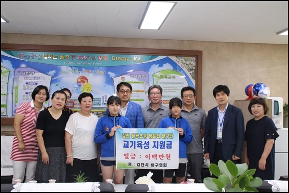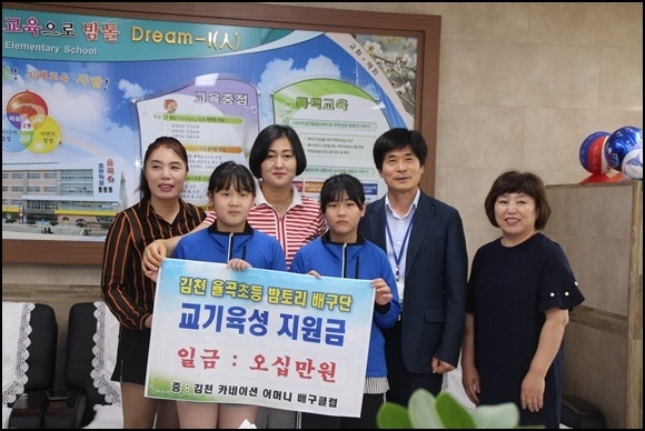 | 율곡초등학교(교장 이삼영)는 2018년 7월 19일 11시에 교장실에서 김천시배구협회와 김천카네이션 어머니 배구단 관계자 분들과 배구부 지원금 전달식을 가졌다. 이날 배구협회 이영철 회장을 비롯하여 김천배구협회 임원, 김천카네이션 어머니 배구단 임원들이 마음을 모아 본교 배구부 활성화를 위해 정성을 모아 후원금을 전달해 주셨다.