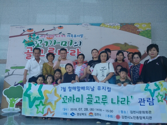 7월 할매할배의 날인 지난 7월 28일(토)에는 노인종합복지관 주관으로 3대(三代) 100여명이 가족 연극 “꼬까미의 골고루 나라”를 관람하였다. 이 연극은 김천시에서 개최하는 김천국제가족연극제에 참여한 작품으로 한국문화예술위원회 우수공연으로 선정된 바 있다.