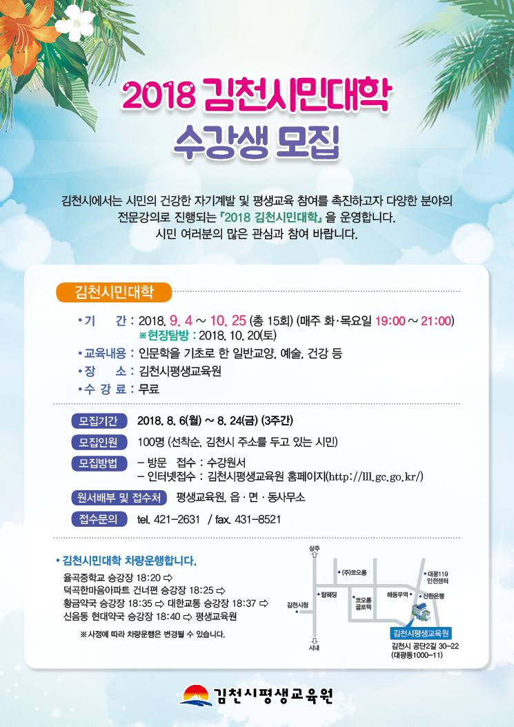 | 김천시(시장 김충섭)는 ‘2018년 김천시민대학’ 수강생 100명을 선착순 모집한다.