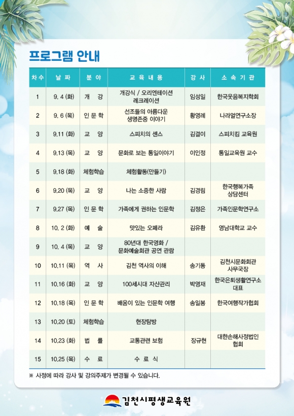 인문학을 기초로 한 일반교양, 예술, 건강 등 다양한 분야의 강의와 체험활동 등 총 15회로 진행되는 김천시민대학은, 공연관람과 현장탐방도 예정되어 있다.