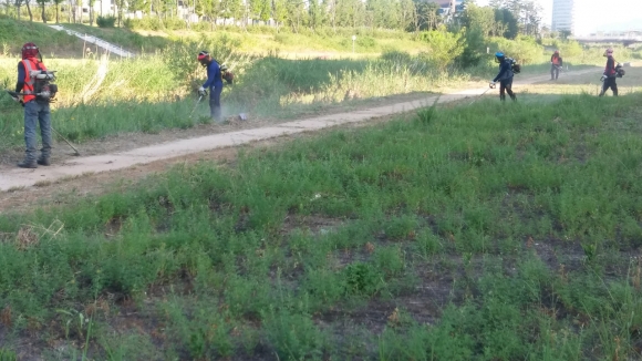 | 율곡동(동장 신장호)은 8월 1일~2일 양일간 율곡천 KTX역사 주변부에서 동김천 IC부근 3.2km(왕복6.4km)산책로 구간에 풀베기 작업을 실시했다.