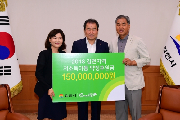 | 김천시(시장 김충섭)와 초록우산어린이재단(경북지역본부장 김창연)은 지난 6일 김천시청에서 지역의 어려운 환경에 있는 아동을 지원하고 희망을 전하기 위해 1억5천만원 후원금을 지원하는 후원금 약정식을 가졌다. 이날 행사는, 초록우산어린이재단과 김천시후원회 관계자 등이 참석하여 김천지역 기업들의 사회공헌활동과 김천시후원회의 적극적인 후원활동으로 아동들이 건강하게 성장하도록 도울 것을 약속했다.
