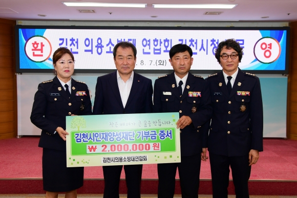 | 김천시 의용소방대연합회(연합회장 박희동,여성연합회장 정희남)에서 8월 7일 김천시청을 방문하여 김천시인재양성재단에 장학기금 2백만원을 기탁했다.