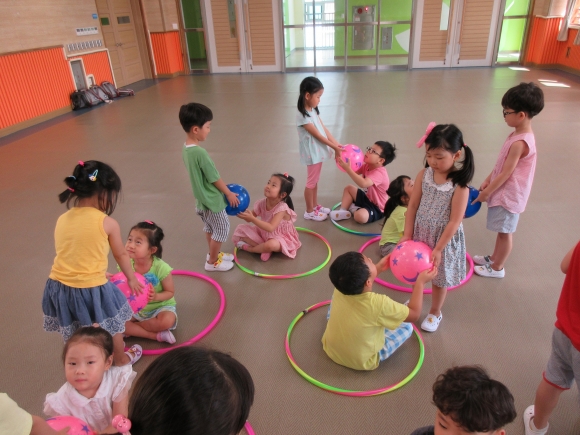 여름방학 계절유치원에서 열매반은 동화책을 읽고, 책을 만드는 활동 중심으로 유아들이 책에 관심을 가지고 흥미를 가질 수 있도록 하였다. 또한, 꽃잎반과 새싹반은 강당에서 공과 훌라후프를 사용하여 무더운 여름을 건강하게 지낼 수 있도록 신체활동을 많이 하고 있다.