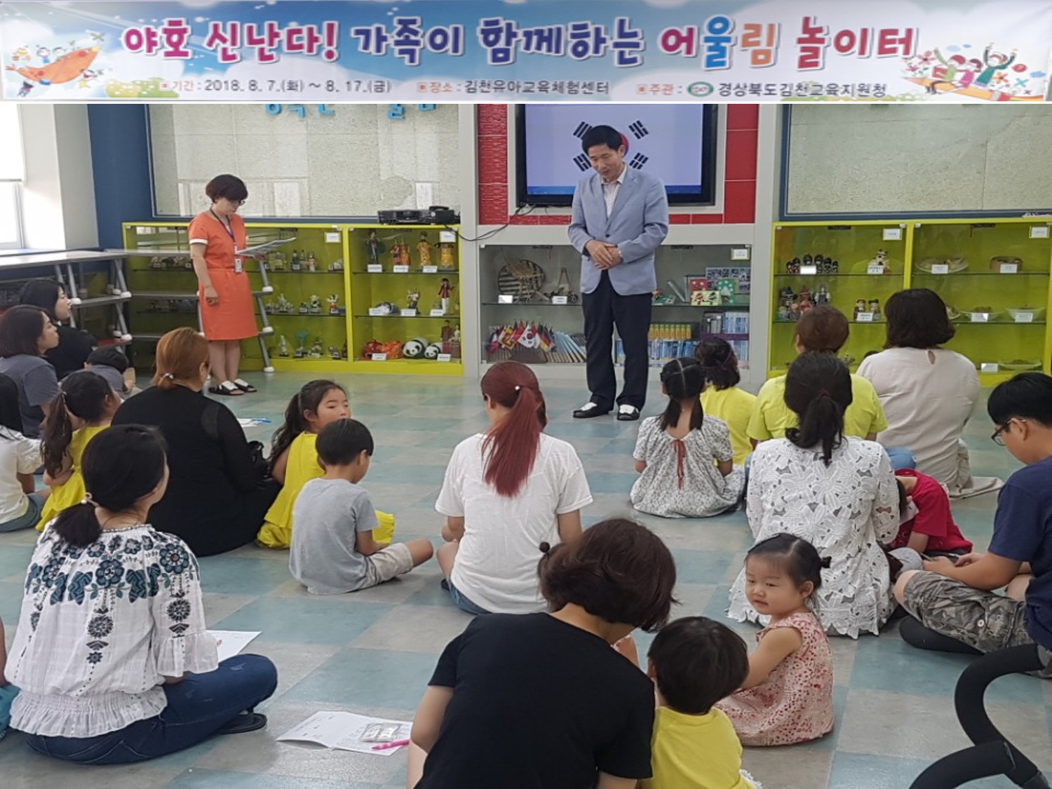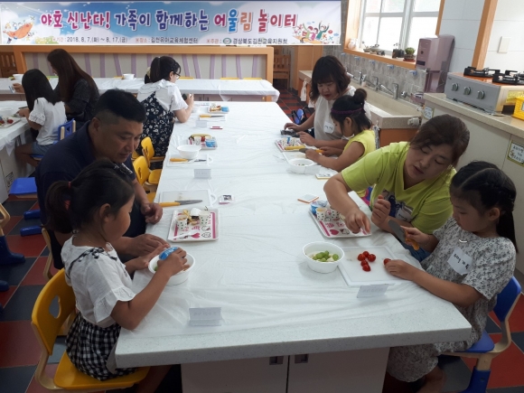 | 경상북도김천교육지원청(교육장 신정숙)은 김천유아교육체험센터에서 2018년 8월 7일(화)부터 8월17일(금)일까지 8일간 김천관내 유치원학부모를 대상으로 ‘야호 신난다! 가족이 함께하는 어울림 놀이터’를 운영한다. 233가족 658명이 참여하는 어울림 놀이터는 8일간 요리활동, 목공놀이, 물놀이, 표현놀이, 탐구놀이 등 다양한 체험활동을 통해 자녀를 보고, 듣고, 느끼고, 이해하는 것에서부터 서로를 인정하고 수용하고 배려하고 협력하는 마음을 길러주고자 한다. 첫날 어울림 놀이터에 참여한 학부모들은 자녀들과 함께 유아의 발달수준에 맞는 쾌적하고 안전한 장소에서 가족 간의 유대감을 높이고 자녀들의 꿈과 끼를 발견할 수 있는 행복하고 소중한 시간이었다고 하였다.