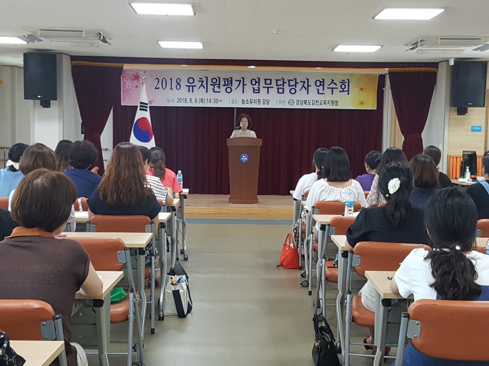 | 경상북도김천교육지원청(교육장 신정숙)은 『2018학년도 유치원 평가 업무 담당자 연수』를 2018년 8월 9일(목) 농소유치원 강당에서 해당 공․사립유치원 유치원 교사 36명을 대상으로 실시하였다.