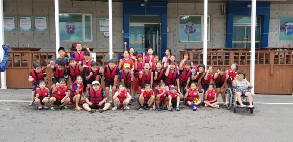 | 의미 있고 안전한 어촌체험을 위하여 먼저 ‘1교1촌 자매결연식’을 하고 구명조끼를 입은 후에 해설사 선생님의 지도와 안내에 따라 카누타기, 통발체험, 고둥잡기 등의 체험활동을 실시하였다. ‘투명 카누타기’체험은 저, 고학년 4명이 한 카누에 타고 노를 저어서 카누를 움직여 바다 위를 항해하는 활동이다. 뒤에 앉은 고학년이 선장이 되어 4명이 협력하여 힘차게 노를 저어야 카누가 움직이는 것으로 협동과 단결심을 기르고 선후배간의 정을 쌓을 수 있는 활동이었다. 바람이 불어 노를 젓기가 어려워 카누의 방향을 제대로 잡기가 힘들었지만 선배의 안내에 따라 후배들도 열심히 노를 저어가며 앞으로 나아가는 모습을 볼 수 있었다.