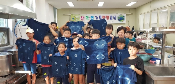 김천발명교육센터 주최 김천농업기술센터 주관으로 실시한 이번 행사는 김천시 천연염색동아리 회장 허미숙 강사님이 천연염색의 효능, 쪽의 특징과 쪽염색의 과정을 실습을 통해 말씀해 주셨다. 오래전부터 쪽은 사람들에게 꾸준한 사랑을 받고 있고 이번 산․학․연 가족발명교실에서 염료 만들기, 쪽물들이기 과정을 거쳐 가족들이 함께 티셔츠 만들기 활동으로 메이커 교육을 하였다.