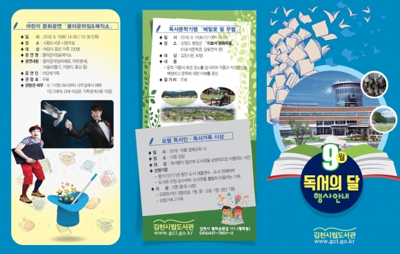 | 김천시립도서관(관장 장귀희)은 독서의 달, 9월을 맞아 시민 독서의욕 고취와 도서관 이용 활성화를 위해 전 연령층이 참여할 수 있는 다채로운 독서문화행사를 개최한다.